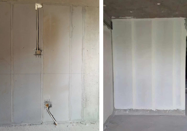 2、ALC隔墙板材或者叫加气混凝土轻质墙板为现场测量、定尺加工生产,施工单面墙1天即可施工完成,ALC隔墙板材为干法施工,不存在现场湿作业。安装完成后的墙面平整度误差不超3mm,ALC隔墙板材墙面无需抹灰,施工完成即可进入墙面涂料油漆的施工工序。